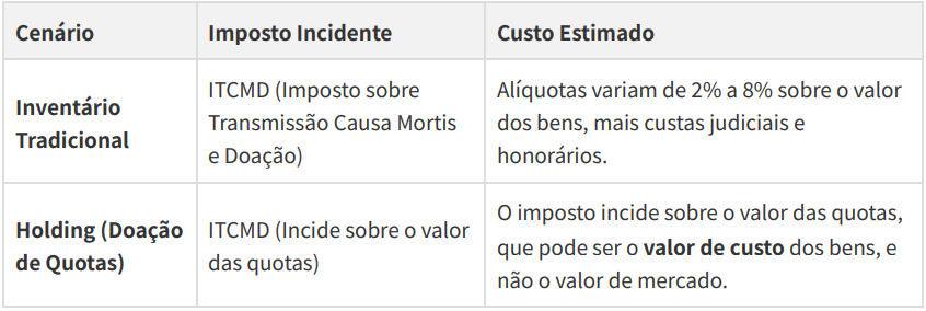 A economia fiscal é um dos maiores atrativos da Holding. A principal vantagem reside na redução do custo de transmissão de bens: